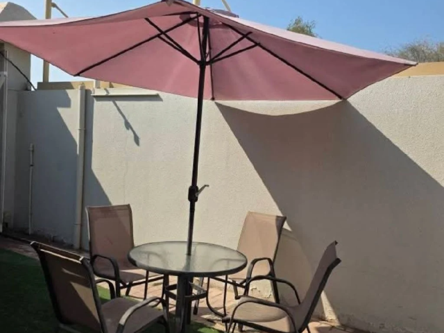 Outdoor dining set for sale in Ras Al Khaimah, consisting of a table, four seats, and a sun umbrella. Suitable for gardens, balconies, patios, or outdoor seating areas. The set is in good condition and ready for use.